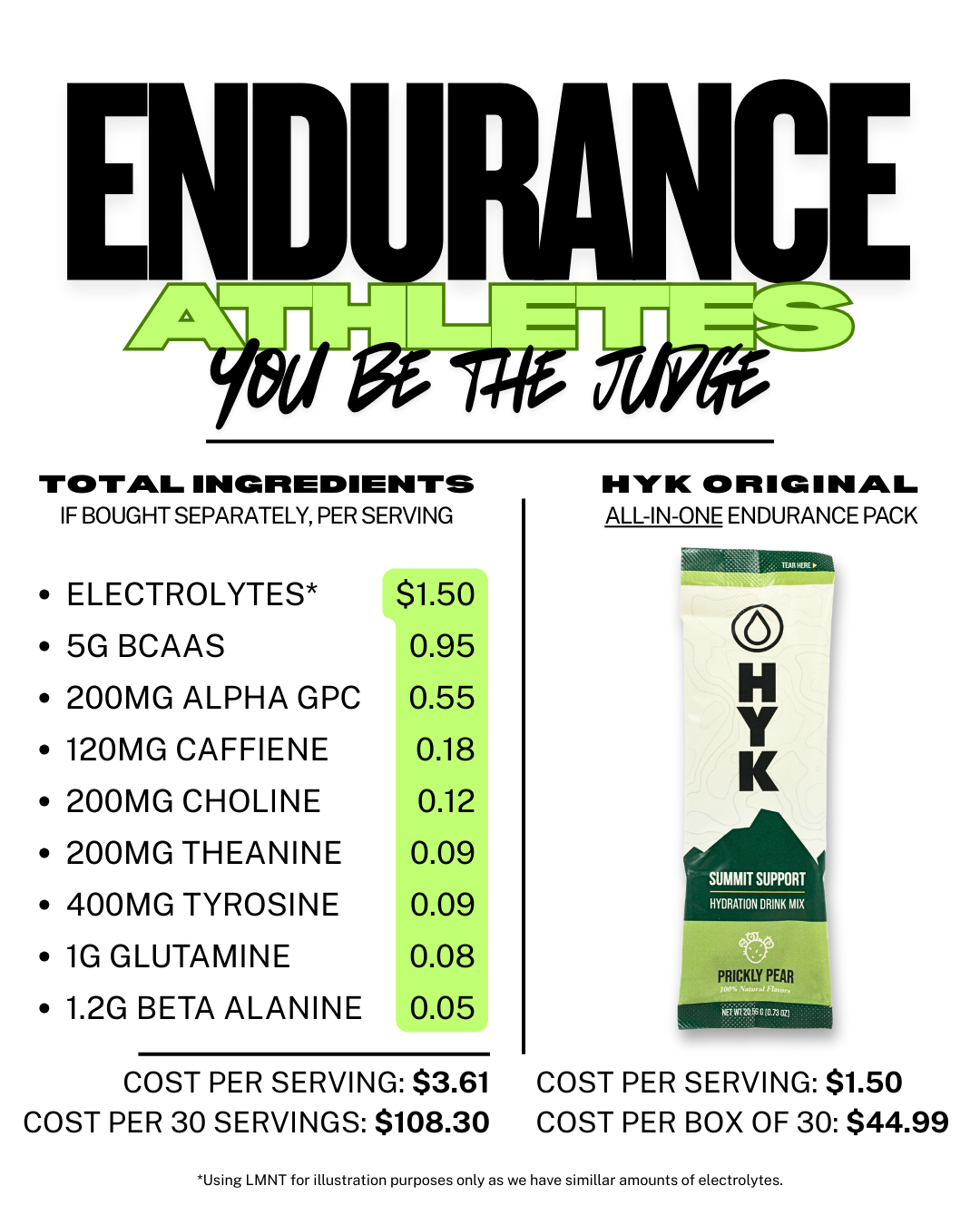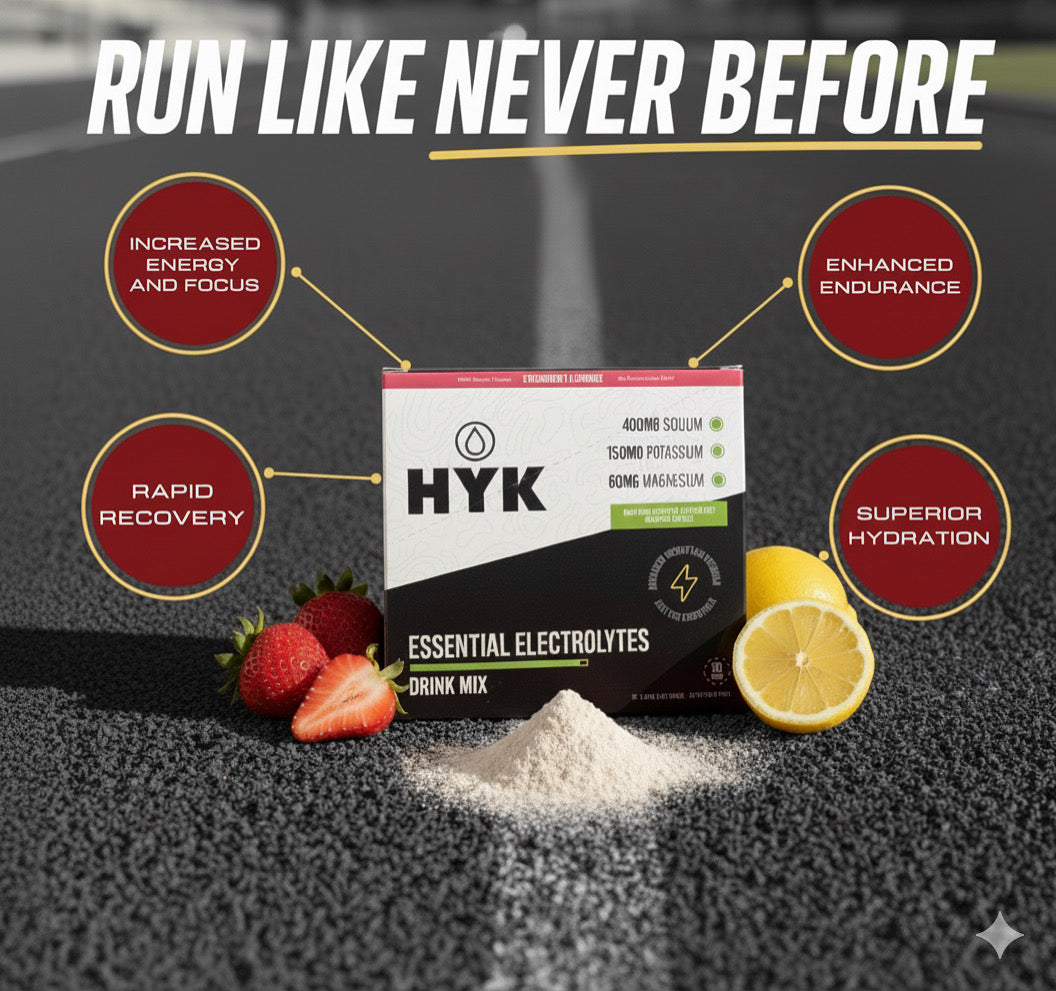 HYK Original isn’t just a hydration mix — it’s full-system fuel. Each serving delivers powerful electrolytes and BCAAs for endurance, natural caffeine from green tea for energy, and nootropics like L-theanine, tyrosine, and Alpha GPC for laser-sharp focus. It’s hydration, energy, focus, and recovery all in one — designed to keep you locked in, mile after mile.