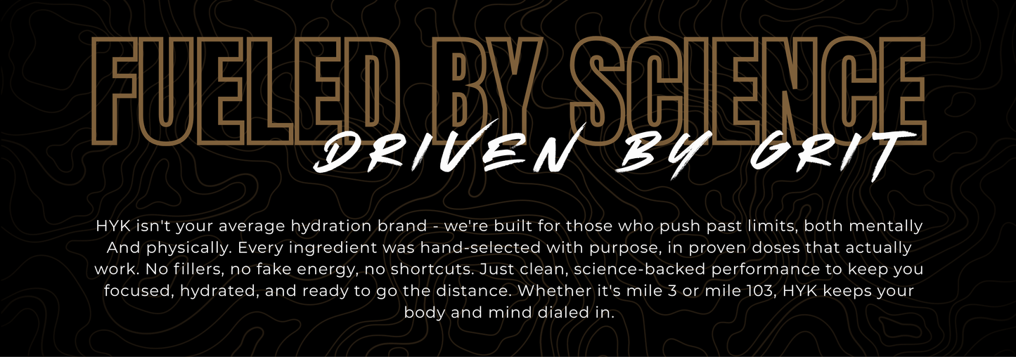 HYK is built for endurance athletes. Every formula is scientifically backed and dosed to perform - no fluff, no marketing BS, no "proprietary blends", no label confusion. We use real electrolytes, amino acids, and focus-enhancing ingredients that actually work.