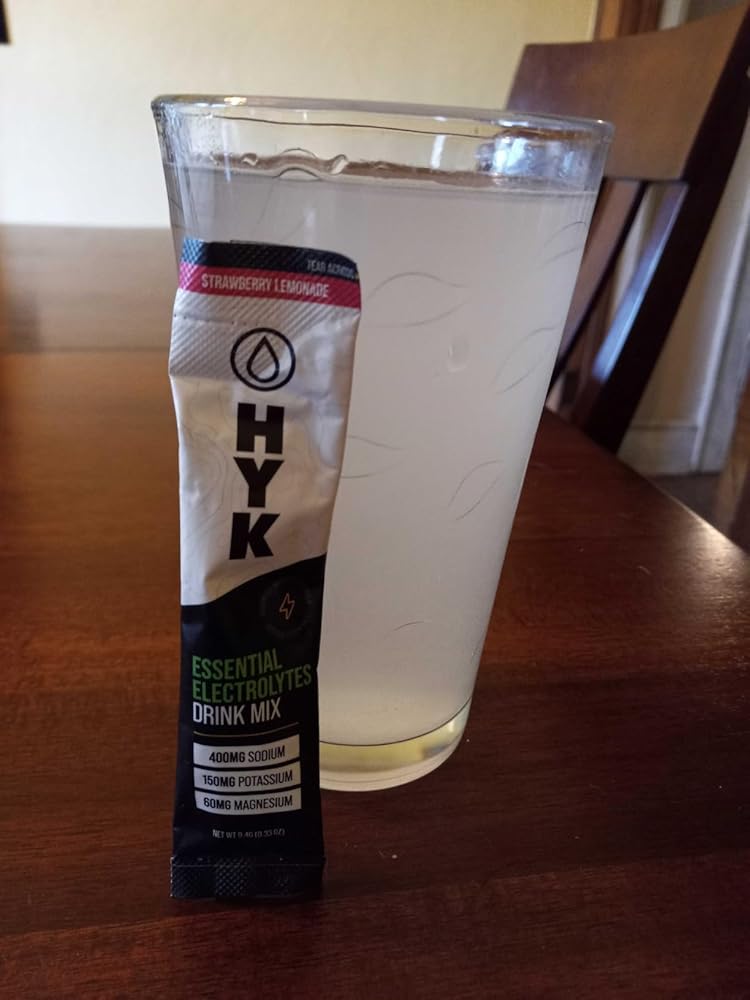 HYK Electrolytes Strawberry Lemonade drink mix packaging with nutrition facts label on a black background